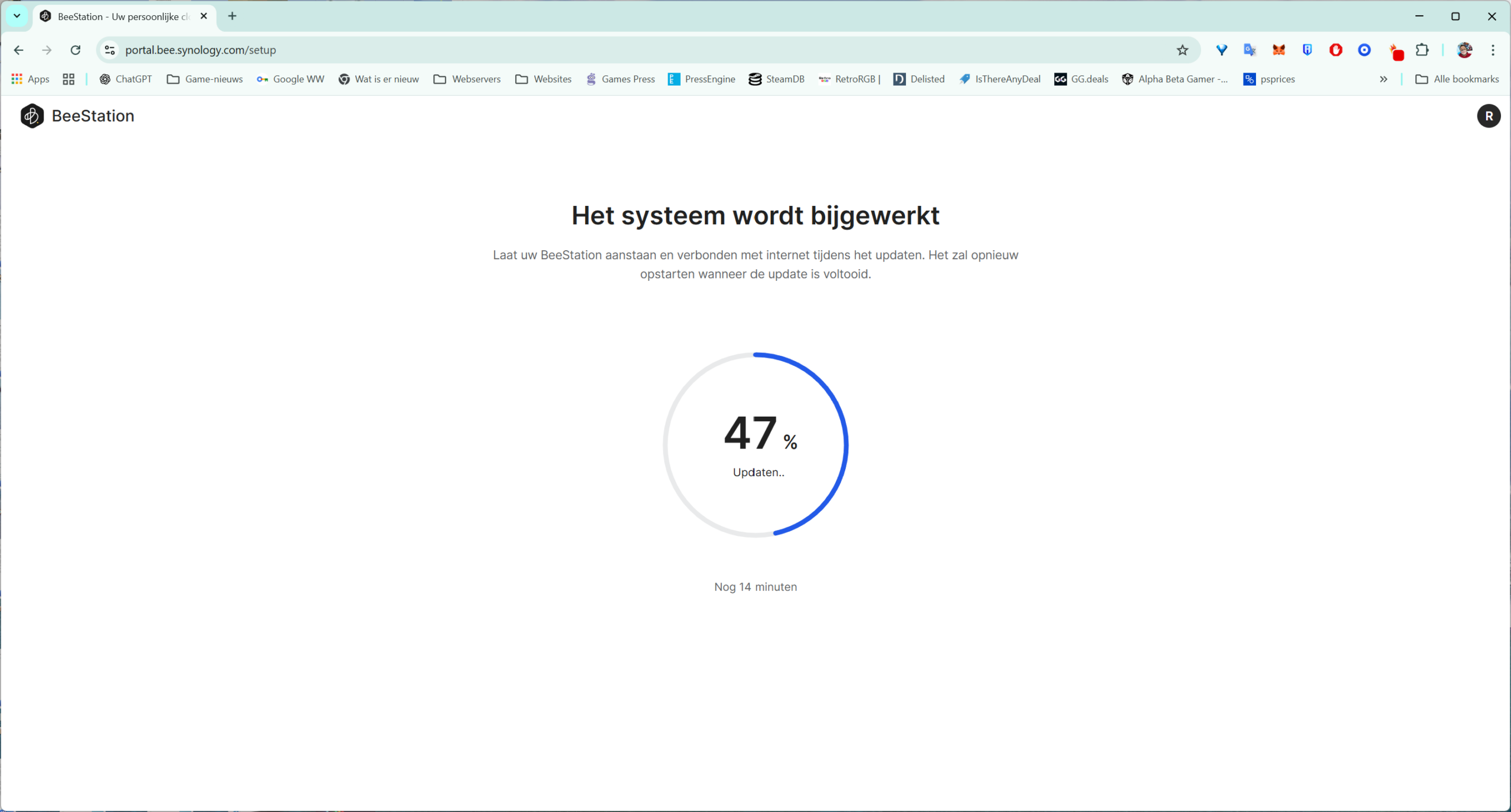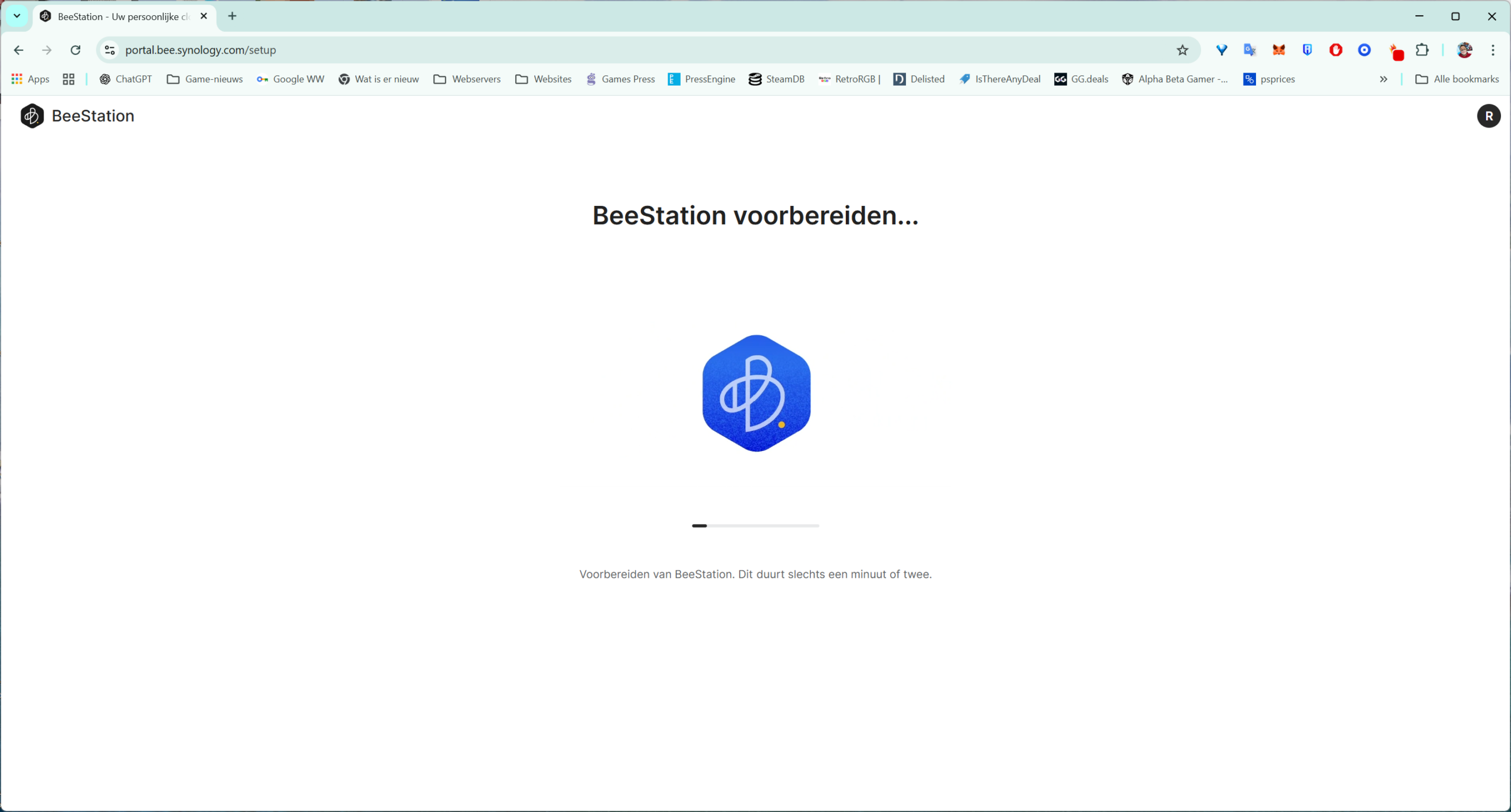 Vervolgens scan je de QR-code uit de handleiding, die je direct naar de configuratiepagina in je browser leidt. Je hebt hiervoor wel een Synology-account nodig. De vervolgstappen zijn simpel: je vult het serienummer in en drukt fysiek op de aan-/uitknop van de BeeStation om te bevestigen dat je bij het apparaat bent. Daarna configureert en update de BeeStation zichzelf grotendeels automatisch.