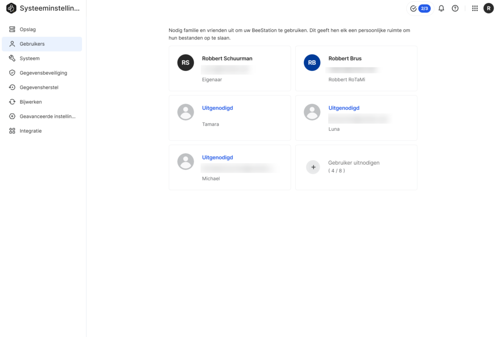 Je kunt meerdere accounts aanmaken op één Synology BeeStation. Via een uitnodigingslink geef je familieleden hun eigen, afgeschermde ruimte. Iedereen krijgt toegang tot BeeFiles en BeePhotos, maar niemand kan elkaars bestanden zien. Voor tieners die gesteld zijn op hun privacy is dit een must; ze hoeven niet bang te zijn dat ouders stiekem meekijken.
