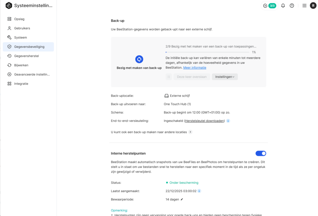 Een wijze les in de tech-wereld: één externe opslag is geen back-up. Als de Synology BeeStation defect raakt (bijvoorbeeld door brand of diefstal), zijn je gegevens alsnog weg. Gelukkig biedt Synology diverse opties voor die noodzakelijke “tweede laag”: De eerste is een Externe harde schijf: Sluit een USB-schijf aan op de BeeStation en stel via de instellingen een automatische back-up in. Dit is de methode die wij zelf gebruiken. De andere bespraken we al eerder kort en is de Synology C2 Cloud: Voor wie geen gedoe wil, biedt Synology een cloud-back-up aan. Dit kost ca. $72,59/jaar voor de 4TB-versie en $145,19/jaar voor de 8TB-versie. Bij een defect kun je je data eenvoudig herstellen via ‘Gegevensherstel’. De laatste is optie is een Tweede NAS: Heb je familie met een Synology NAS of een tweede locatie als een vakantiehuis? Dan kun je de BeeStation automatisch daarheen laten back-uppen.