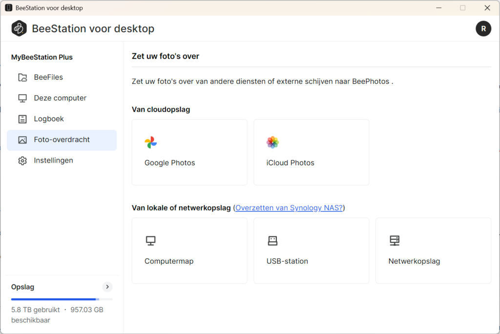 Met de BeeStation hoef je geen afscheid te nemen van diensten als iCloud of Google Drive. Sterker nog: je kunt ze koppelen om automatisch een lokale back-up te maken van je cloudbestanden. De BeeStation ondersteunt o.a. Google Photos, iCloud Photos, Dropbox, OneDrive en Google Drive. Let er wel op dat Foto-diensten (Google/iCloud Photos) via BeePhotos gekoppeld worden en bestandsdiensten als Dropbox/OneDrive via BeeFiles gekoppeld worden.