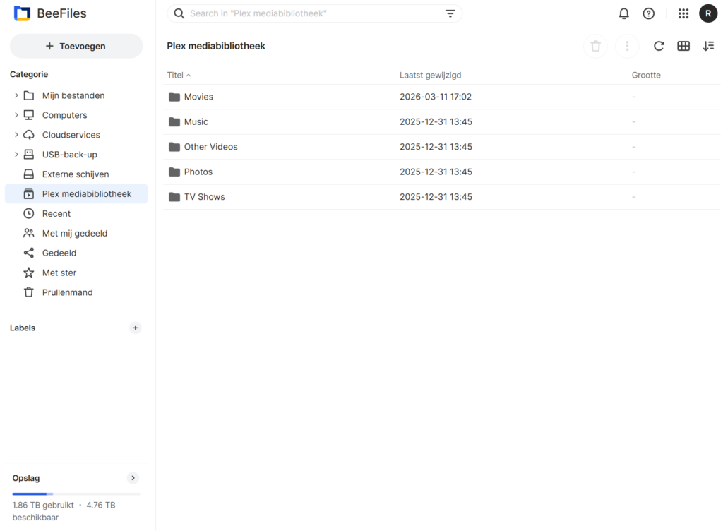 Plaats je mediabestanden vervolgens in de Plex-bibliotheekmappen, bijvoorbeeld: Movies, TV Shows of Music.
