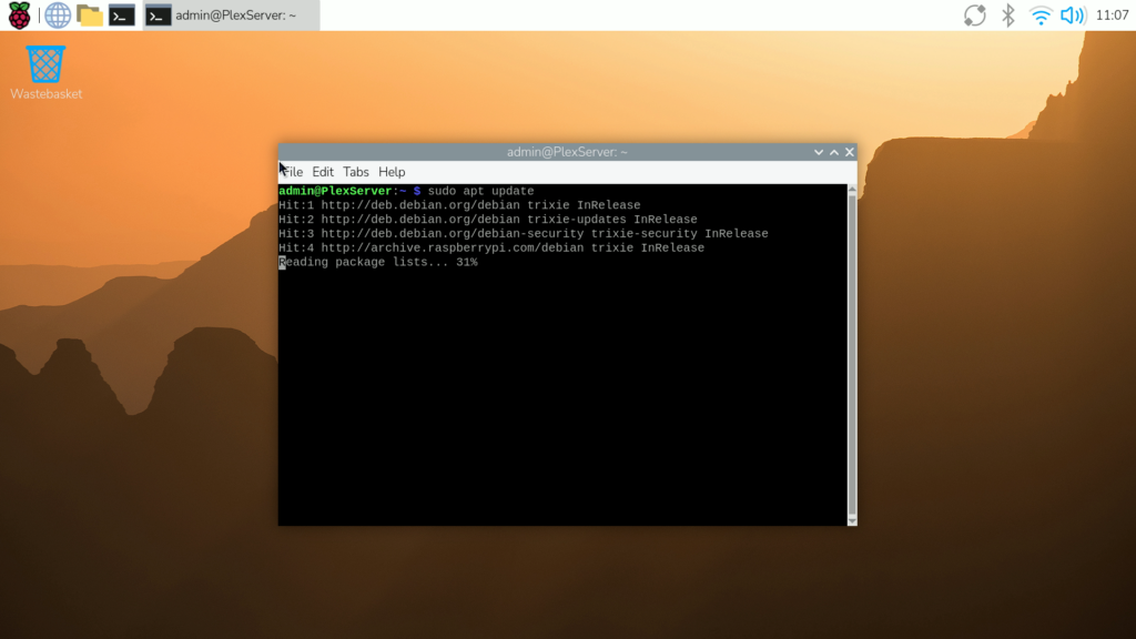 Start je Raspberry Pi en open de Terminal. Werk eerst het systeem bij met de volgende opdrachten: