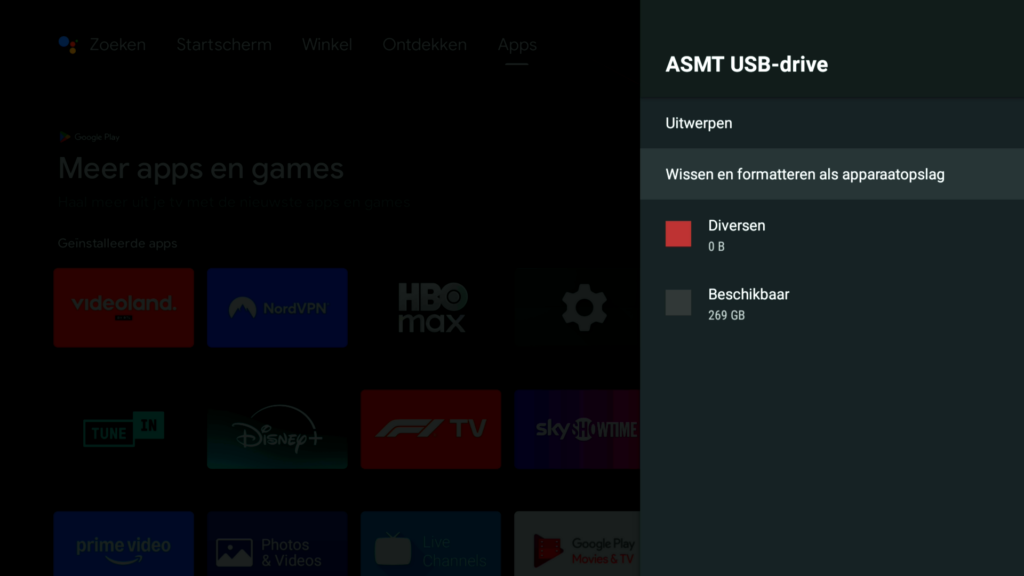Sluit de harde schijf of SSD aan op de USB-poort van de NVIDIA Shield TV Pro en ga vervolgens naar: