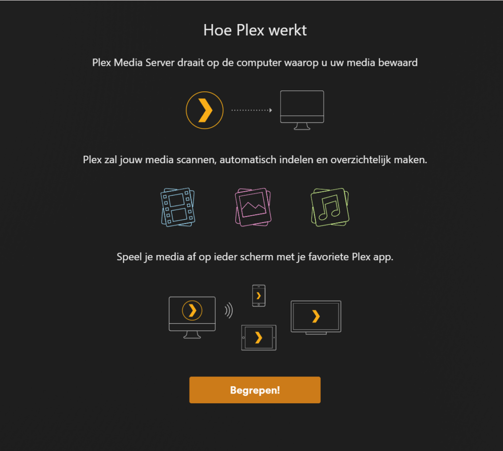 Je krijgt eerst een melding dat de Plex Media Server draait op de computer waarop je media wordt opgeslagen. Klik op Begrepen om verder te gaan. Wanneer Plex vraagt om te upgraden naar een betaald abonnement kun je dit venster sluiten via het kruisje rechtsboven.