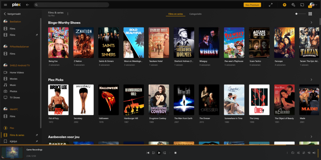 Voor deze cursus gebruik ik Plex als basis. Dat is niet zonder reden. Plex biedt een ervaring die sterk lijkt op die van streamingdiensten zoals Netflix of Disney+. De interface ziet er overzichtelijk uit, haalt automatisch filmposters en beschrijvingen op en onthoudt precies waar je bent gebleven met kijken.