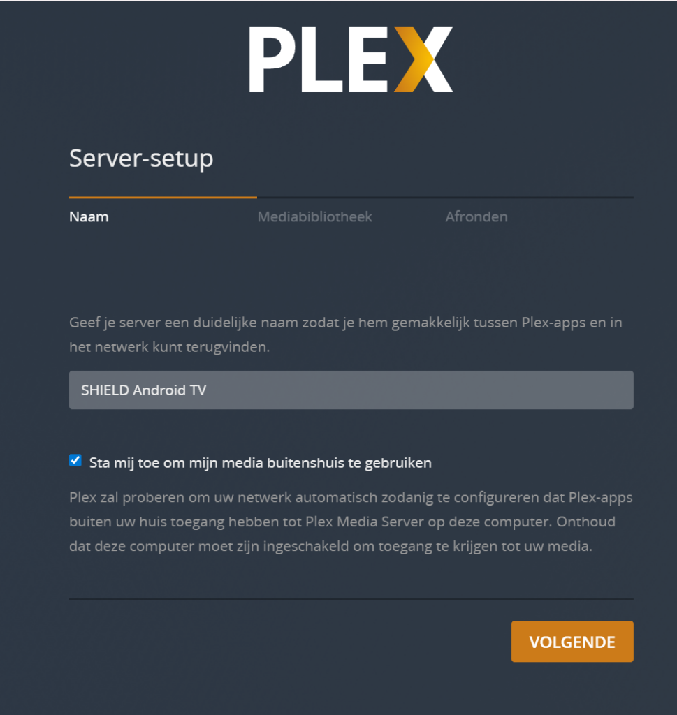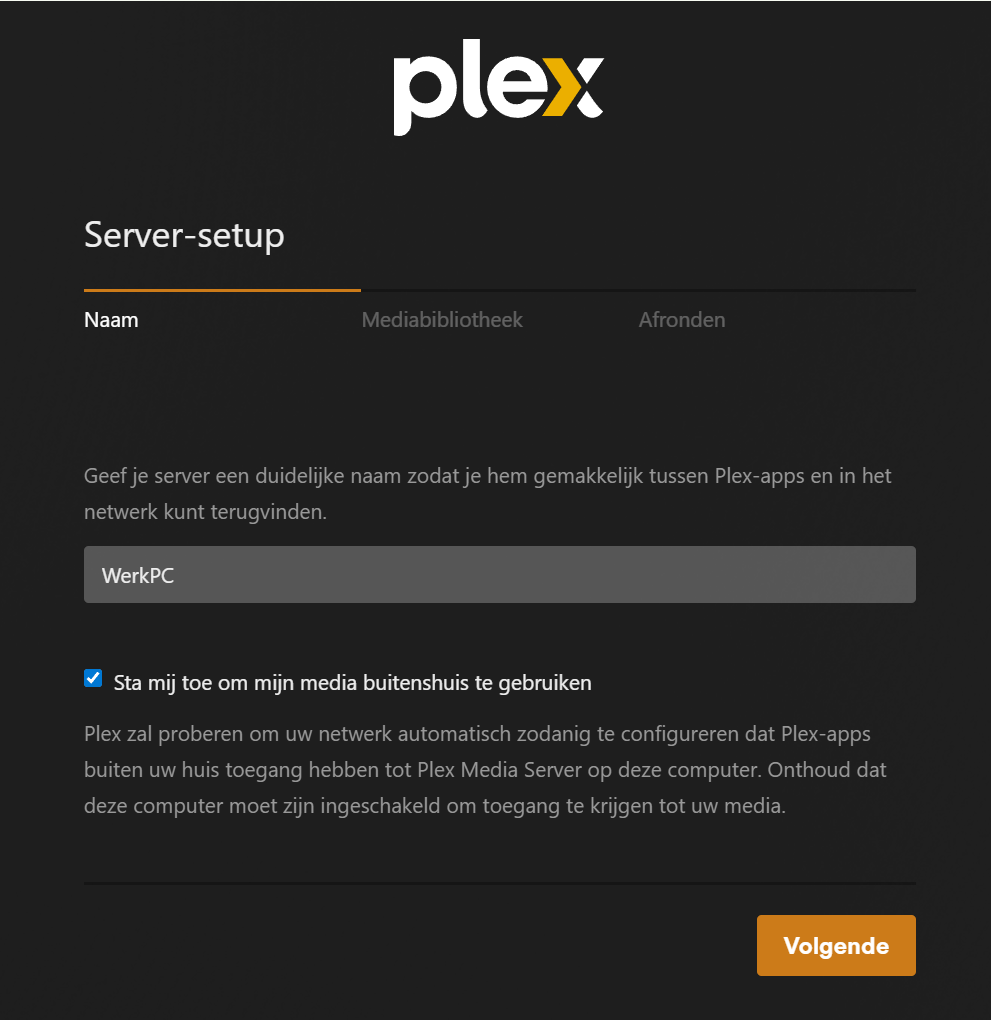 Geef vervolgens een naam aan je Plex Media Server. Haal eventueel het vinkje weg bij Sta mij toe om mijn media buitenshuis te gebruiken en klik op Volgende.