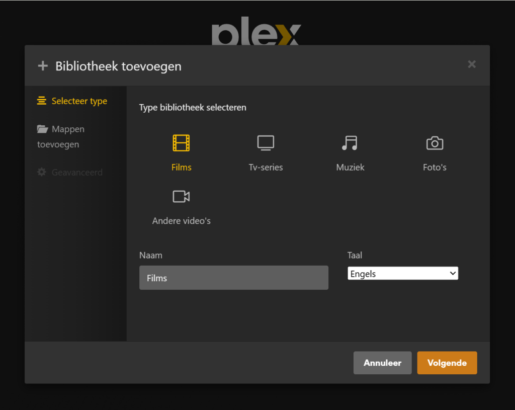 Kies bijvoorbeeld Films en klik op Volgende. Klik daarna op Blader naar de mediamap en selecteer een map binnen /volume1/PlexMediaLibrary.