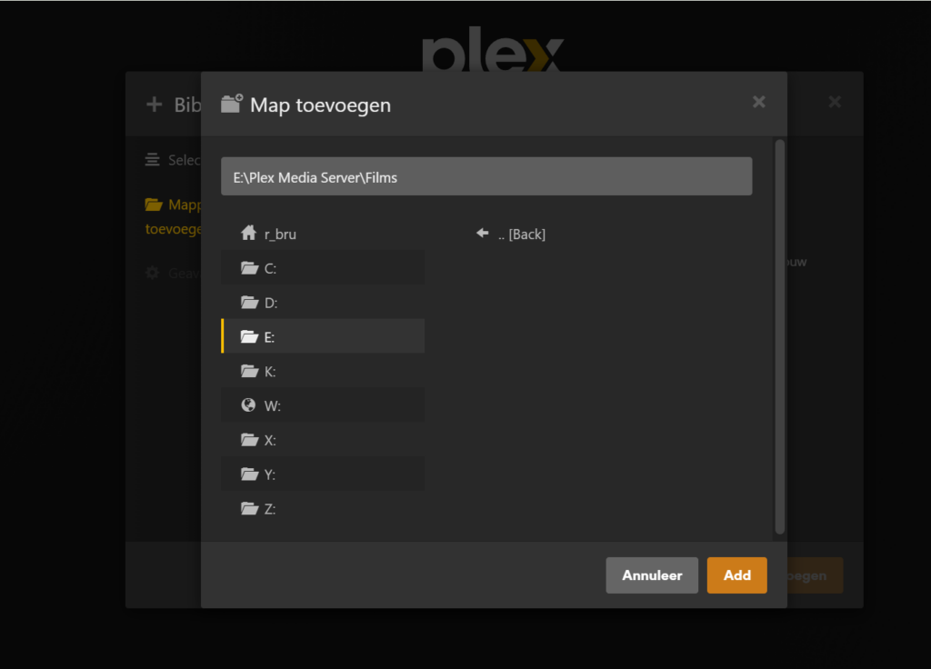 Nu kies je de map waarin je films worden opgeslagen. Omdat we nog geen bestanden hebben toegevoegd, heb ik op mijn E-schijf een map aangemaakt met de naam Plex Media Server. Daarin staat een tweede map genaamd Films, waarin ik mijn gedigitaliseerde dvd’s plaats.