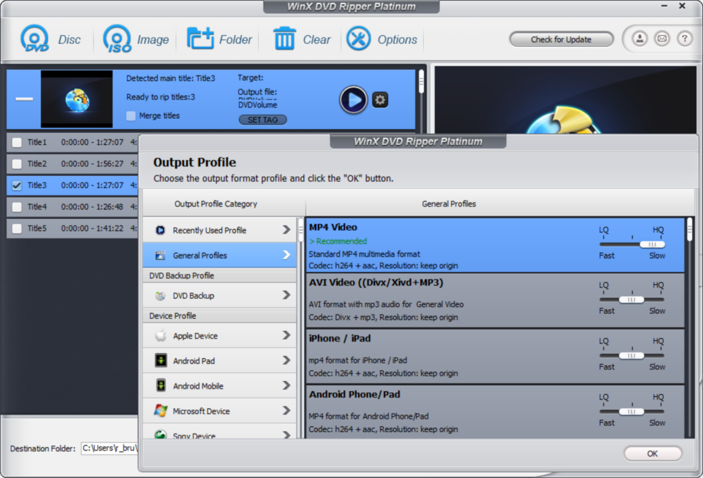 Start vervolgens het programma en plaats de dvd in de dvd-drive. Klik bovenin op Disc en selecteer de juiste Disc Drive. Zorg dat de optie Auto Detect is ingeschakeld en klik op OK. Het programma scant nu de dvd en vraagt vervolgens in welk formaat je de film wilt opslaan.