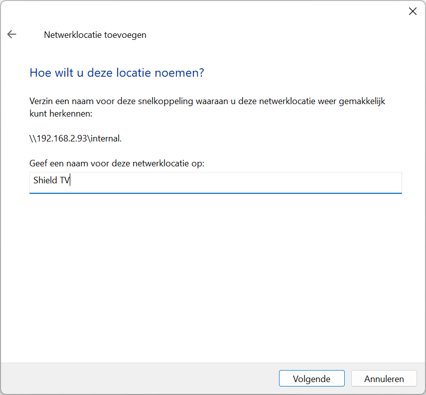 Klik op Volgende, geef de locatie een naam (bijvoorbeeld Shield TV) en klik opnieuw op Volgende.